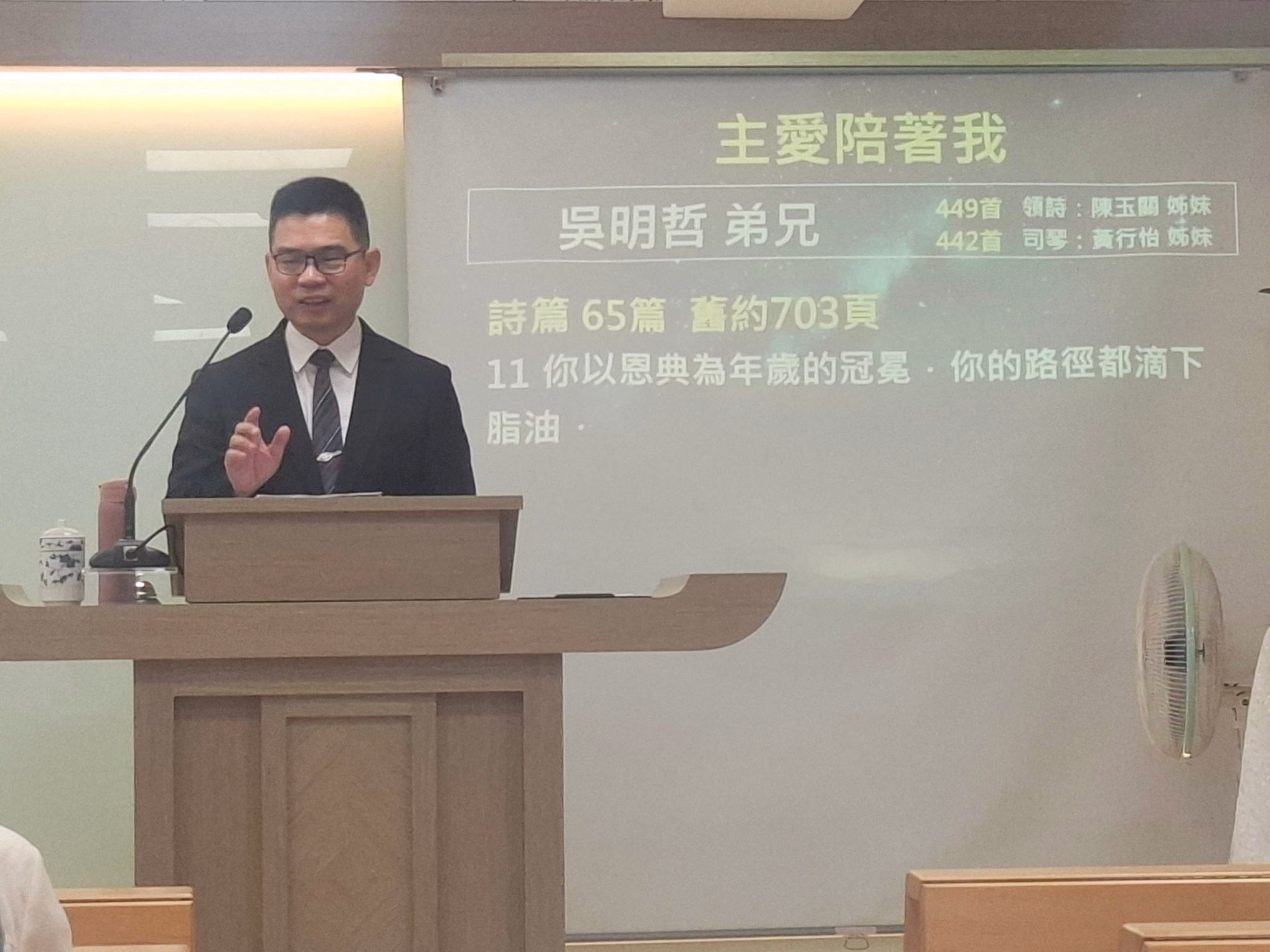 季佈道邀請鶯歌教會吳明哲弟兄見證,主題為〈主愛陪著我〉,內容見證神在信仰歷程中的揀選、保守、呼召與操練。